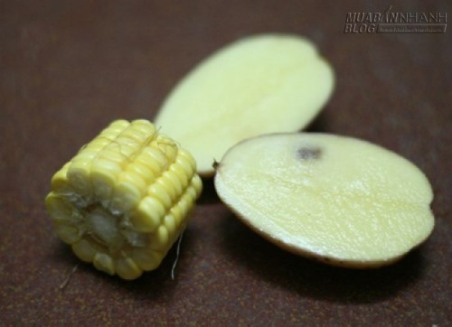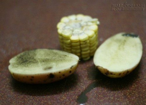 Ngô và khoai tây mới xắt còn tươi nguyên trước lúc thử "luộc" với 2 loại bột thông cống.