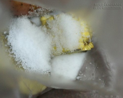 Tiếp tục thử nghiệm luộc với bột thông cống bằng chất hóa học, chúng tôi tiến hành thả 2 muỗng cà phê bột thông cống hóa học vào túi nilon, theo quan sát thì đối với loại bột này có màu trắng tinh hệt đường kính trắng, không mùi. Ngay sau đó tiến hành thả 2 miếng khoai tây, 1 miếng ngô ngọt vào và tiến hành đổ nước.