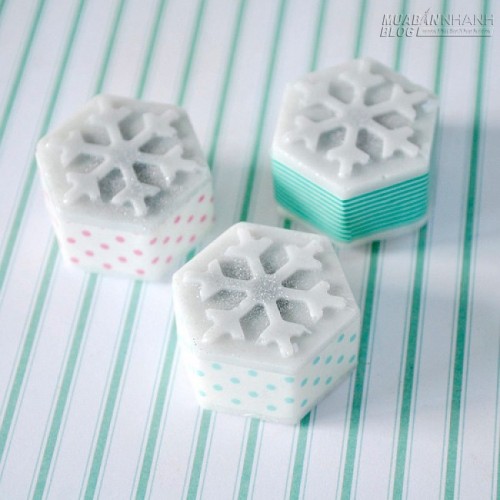 Để làm ra những viên xà phòng hình bông tuyết, bạn cần chuẩn bị một phôi xà phòng màu trắng, nhũ bạc mỹ phẩm, tinh dầu thơm bạc hà, khuôn hình bông tuyết. Dùng dao xắt nhỏ phôi xà phòng, cho vào bát và quay nóng chảy trong lò vi sóng. Thêm tinh dầu thơm, nhũ bạc và khuấy đều các nguyên liệu với nhau. Nhanh tay đổ hỗn hợp vào khuôn khi còn nóng và đợi nó đông cứng lại.
