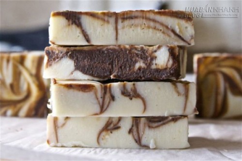 Và đây là một công thức làm xà phòng "thơm ngon" khác và cũng rất dễ thực hiện. Bạn sẽ cần đến dầu hạt hướng dương, dầu ô liu, dầu hạt cải, dầu dừa, nước, dung dịch kiềm, tinh dầu bạc hà, cà phê, sô-cô-la và bột ca cao.