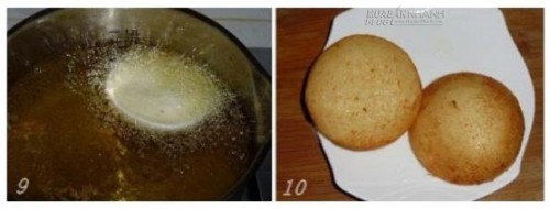 3. Đổ nhiều dầu ăn vào chảo đun sôi, thả bánh kem vào chiên nhanh, bánh sẽ mau vàng rộm vỏ ngoài trong khi kem chưa kịp chảy nước. Nhấc bánh ra khay lót giấy thấm dầu.