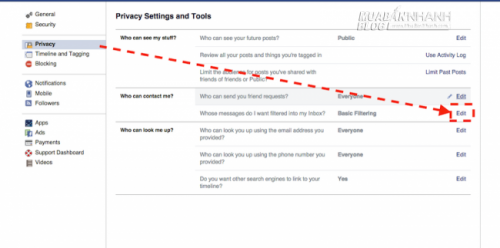 Chọn Privacy (Quyền Riêng Tư). Tại phần “Who can contact me?” (Ai có thể liên hệ với tôi), bạn chọn Edit (Chỉnh sửa) ở mục “Whose messages do I want filtered into my Inbox?” (Lọc tin nhắn từ người khác đến hộp thư của mình).