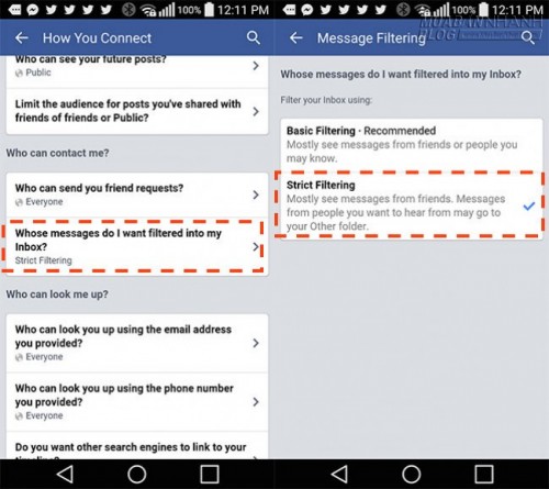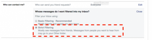 Tại phần: “Who can contact me?” (Ai có thể liên hệ với tôi), bạn chọn vào mục“Whose messages do I want filtered into my Inbox?” (Lọc tin nhắn từ người khác đến hộp thư của mình). Chọn “Strict Filtering” (Lọc nghiêm ngặt).