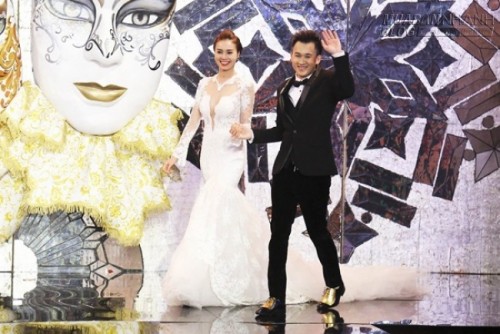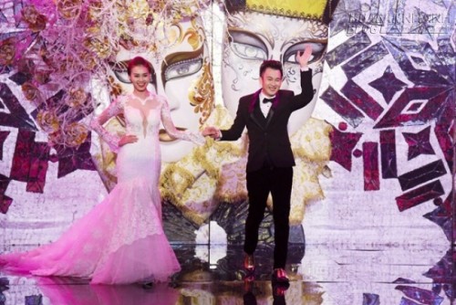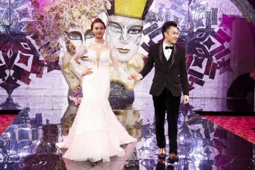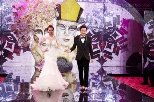 Khi xuất hiện trên sân khấu, cặp đôi Dương Triệu Vũ – Ninh Dương Lan Ngọc gây bất ngờ với những bước đi không kém người mẫu chuyên nghiệp. Nếu Ninh Dương Lan Ngọc dịu dàng, gợi cảm với váy cưới có những đường khoét táo bạo thì Dương Triệu Vũ lại gây ấn tượng mạnh bởi hình ảnh lịch lãm, phong cách.