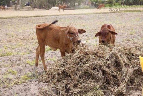 Trên các cánh đồng, nam giới mạnh tay lo việc nhổ đậu rồi xếp trên luống. Phụ nữ thì tuốt đậu, phần hạt bỏ vô thúng, phần thân bỏ sang bên. Phần thân này trước tiên để luôn trên ruộng cho trâu bò cột thả gần đó ra ăn, phần sau đưa về chuồng gần nhà cũng là cho trâu bò ăn, nhưng là ăn thêm.