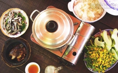Một suất lẩu cá linh bông điên điển trong rừng tràm Trà Sư. Ảnh: Hương Chi