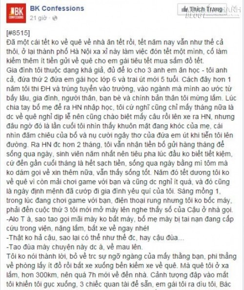 Vài giờ trước, trên trang confessions của một trường đại học ở Hà Nội đã đăng tải một dòng tâm sự của một nam sinh viên về nỗi ám ảnh khi một cái Tết nữa lại về. Đối với nhiều người, Tết là để sum họp, về với vòng tay cha mẹ nhưng với chàng trai này, Tết chỉ là một ký ức buồn, một sự day dứt với lương tâm, một vết cắt trong lòng khó có thể lành lại.