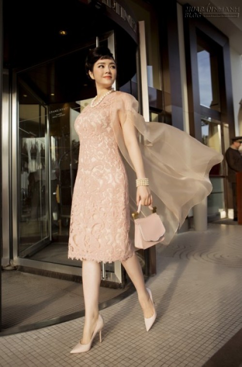 Cô diện bộ đầm ren màu hồng phấn của Tadashi Shoji, áo choàng mỏng cùng tone màu của Safiyaa, đi giày Dior, xách túi Thale Blanc, đồng thời kết hợp cùng bộ trang sức ngọc trai sang trọng.
