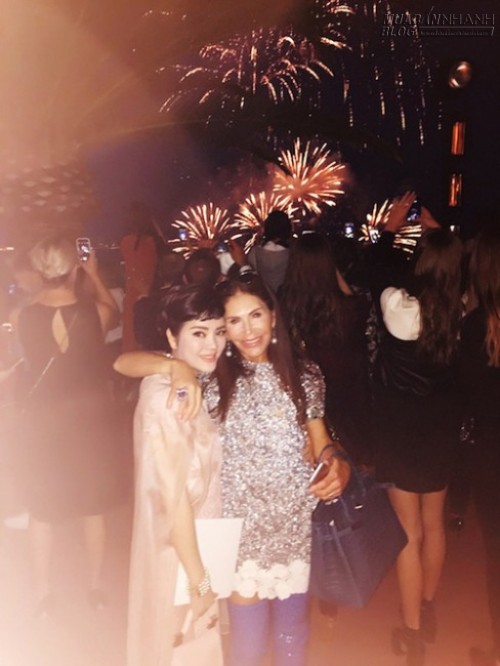 Lý Nhã Kỳ còn gặp lại tỷ phú Trung Đông, Mouna Ayoub. Cả hai cùng nhiều vị khách đã xem màn pháo hoa rực rỡ từ tòa biệt thự trên đỉnh núi.