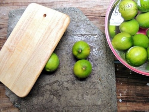 Chanh sau khi mua về rửa sạch. Sau đó pha 100g muối cùng nước để được dung dịch muối loãng, ngâm chanh khoảng 30 phút để chanh dịu và mềm.