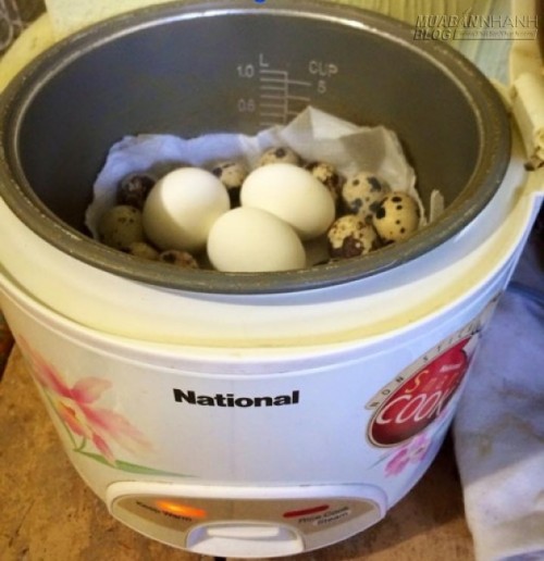 - Đặt trứng lên trên khăn giấy, đậy nắp nồi cơm điện lại, bấm nút “Cook”. Nồi nhà mình 5 phút là nhảy sang nút “warm” là chín. Nếu ai muốn ăn trứng chín kỹ hơn thì ấn thêm 1 lần nút “cook” nữa thôi.