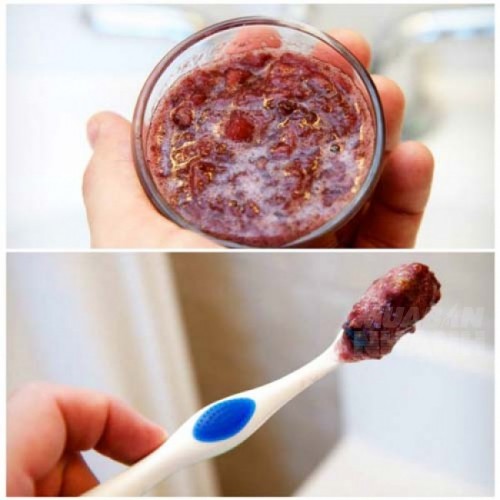 - Làm mềm bải chải bằng cách nhúng vào bát nước ấm rồi nhúng bàn chải vào hỗn hợp dâu và baking soda rồi đánh răng như bình thường trong vòng 2 phút.