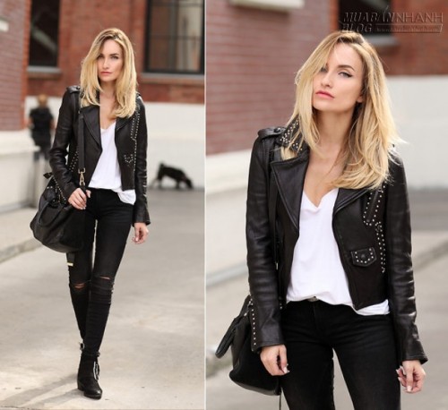 Cô nàng Silvia P đón đông về với set đồ màu sắc trung tính nhã nhặn. Áo jacket da mix cùng quần skinny rách màu đen. Áo thun trắng giản dị là điểm nhấn của cả set đồ.