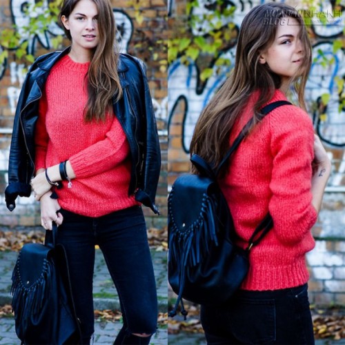 Jacky lại lựa chọn cho mình phong cách năng động xuống phố mùa thu đông với áo len màu hồng cam nổi bật cùng quần jean và áo jaket da màu đen. Chiếc balo tua rua cũng là phụ kiện giúp set đồ nổi bật hơn.