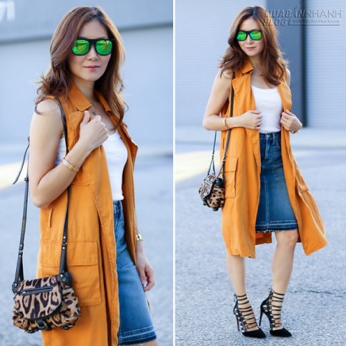 Nếu thời tiết không quá lạnh, bạn hoàn toàn có thể chọn kiểu áo blazer dáng gile trẻ trung. Blogger Yuzi K đến từ Mỹ rất tinh tế khi mix chúng cùng chân váy denim xanh và áo thun trắng đơn giản. Đôi giày cao gót buộc giây nữ tính sẽ mang đến cho người mặc vẻ nữ tính hơn.