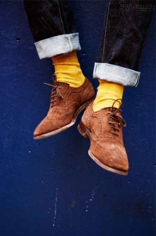Quần jeans, giày brogue da lộn và tất vàng. Phù hợp cho một phong cách trẻ, phớt chút bụi và thích “nghịch”.