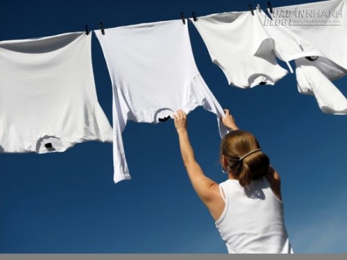 - Khi phơi nên treo quần áo vào mắc để quần áo nhanh khô và có độ phẳng. Trước khi phơi nên lau dây phơi để tránh làm cho quần áo bị dính bẩn và lem sau mỗi trận mưa. Trải rộng bề mặt quần áo cần phơi để khô nhanh hơn.