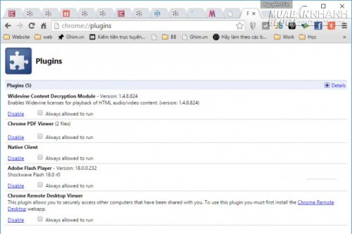Bạn chạy Chrome, gõ dòng lệnh about:plugins rồi tìm và bấm chuột lên hàng chữ Disablecó ứng dụng muốn tắt.