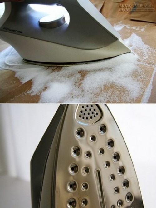 Bàn là dùng lâu ngày có thể bị các vết gỉ bẩn bám chặt. Bạn chỉ cần rắc 1 lượng lớn muối lên chiếc bàn để ủi quần áo, bật bàn là ở mức nhiệt độ cao nhất. Khi bàn là nóng lên, hãy đặt bàn là lên muối như đang là quần áo. Muối sẽ giúp loại bỏ các vết gỉ, bẩn và giúp bàn là sáng bóng.