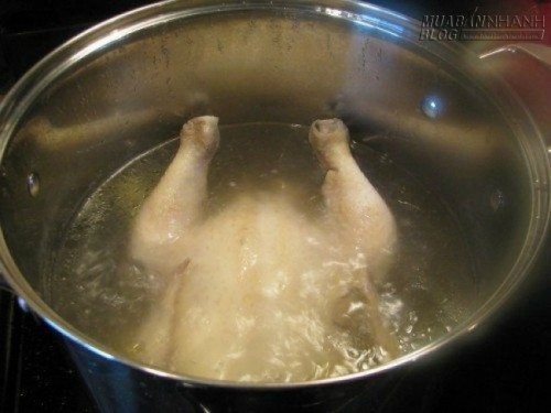 - Nếu bạn đổ không ngập nước, thì trong quá trình luộc và om trên bếp, nhớ trở gà 1-2 lần.
