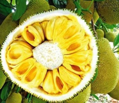 Mít chín tự nhiên sẽ có những đặc điểm như gai nở to, màu xanh vàng, xam xám và chín đều từ cuống cho đến đít quả.