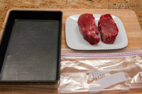 Bạn cần có: Một miếng thịt bò ngon (phần nhiều nạc như thăn bò, lườn, mông), một con dao sắc, một khay kim loại, một túi ziplock đựng đồ trữ lạnh.