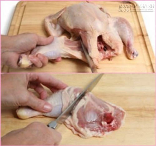 Bạn dùng dao, kéo căng phần đùi ra khỏi thân và cắt phần đùi gà trước. Sau đó lật ngửa miếng đùi vừa cắt và dùng dao thái giữa đoạn nối liền khớp kết nối chính giữa đùi tỏi và má đùi.