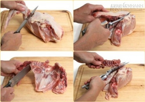 Tiếp theo, bạn thái cánh gà, cách làm tương tự với đùi gà. Dùng kéo cắt dọc theo một bên xương sống lưng gà đến phần cổ gà. Làm tương tự với bên còn lại.