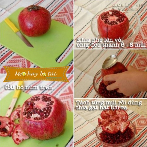 Với lựu, bạn cắt bỏ phần núm, sau đó khía nhẹ ngoài vỏ chia đều thành 6 phần, tách từng múi rồi lấy thìa gạt hạt lựu ra đĩa.