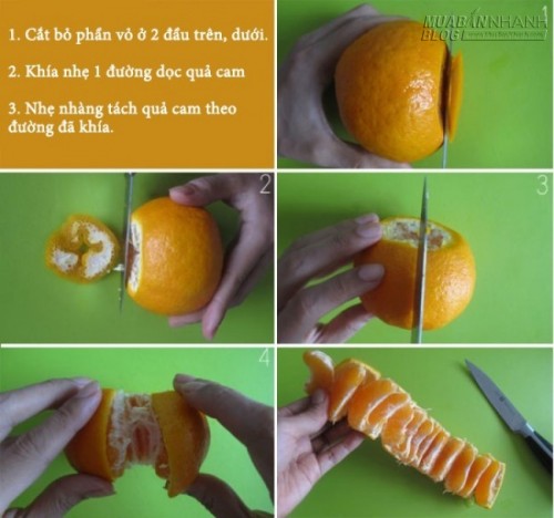 Cắt bỏ phần núm cam hoặc quýt, sau đó khía 1 đường dọc theo thân quả cam, tách quả cam/quýt theo đường đã khía. Cách làm này áp dụng trên quýt có vẻ dễ dàng hơn với cam