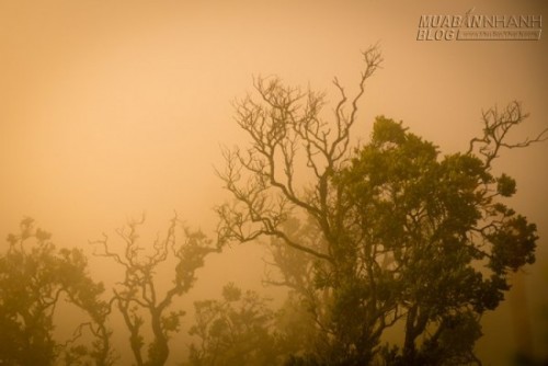 Cây cối khi bị bao phủ bởi sương mù và ánh mặt trời chiếu sáng tạo nên một cảnh quan kỳ lạ.