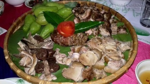 Cỗ mán với thịt lợn, dồi, rau củ tươi ngon. Ảnh: Lê Thương. |
