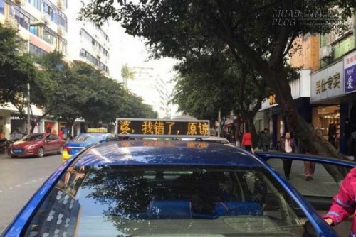 Hôm 2/1, tất cả taxi trong thành phố Nghi Tân, tỉnh Tứ Xuyên, Trung Quốc đồng loạt xuất hiện dòng chữ: ‘Vợ ơi, anh sai rồi. Tha Thứ cho anh nhé. A Cường’ khiến không ít người xôn xao.