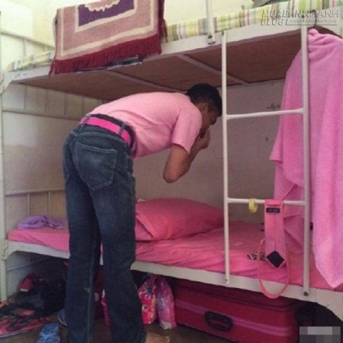 Từ quần áo, chăn gối, giày dép, vali, khăn tắm, mũ, giỏ đựng đồ… đến cả vỏ xà phòng, gói bột giặt hay xô chậu của anh chàng trong ký túc xá đều là màu hồng.