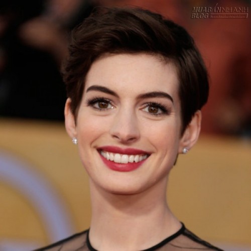 Nữ diễn viên Anna Hathaway trên thảm đỏ với kiểu trang điểm son đỏ cổ điển