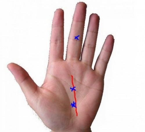 5. Trên đường số mệnh xuất hiện hình ngôi sao hoặc bị cường cản trở cắt qua, hoặc giữa đốt thứ hai và đốt thứ ba của ngón giữa xuất hiện hình ngôi sao, dự báo người này có thể sẽ gặp thất bại và sa sút, làm thay đổi cuộc sống, vợ chồng chia tay… gây ra đả kích khá lớn khiến cuộc đời rẽ sang một hướng khác. (Hình ảnh 3)
