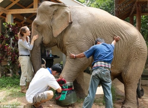 Cô voi đang được các nhà bảo vệ động vật mang chiếc giày khổng lồ. (Ảnh: Evelyn Connor)