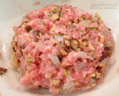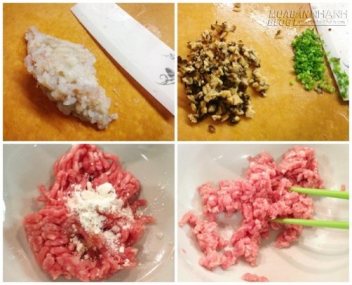 - Tôm bóc vỏ, bỏ chỉ, băm nhỏ. Cho thịt vào bát rồi thêm các gia vị ướp thịt vào, trộn đều.