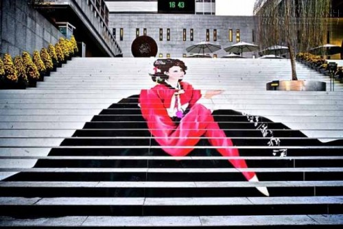 Thiếu nữ trong trang phục truyền thống trên cầu thang dẫn tới một nhà hát ở Seoul, Hàn Quốc.