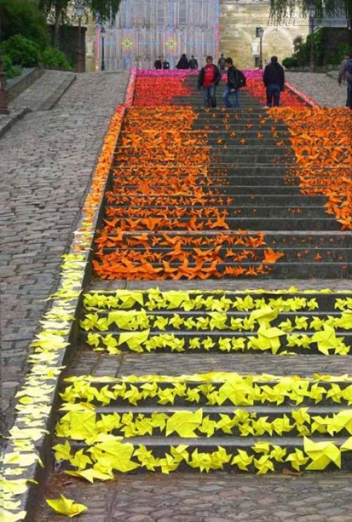 Nghệ thuật origami do nghệ sỹ Mademoiselle Maurice thực hiện trên cầu thang ở thành phố Angers, Pháp.