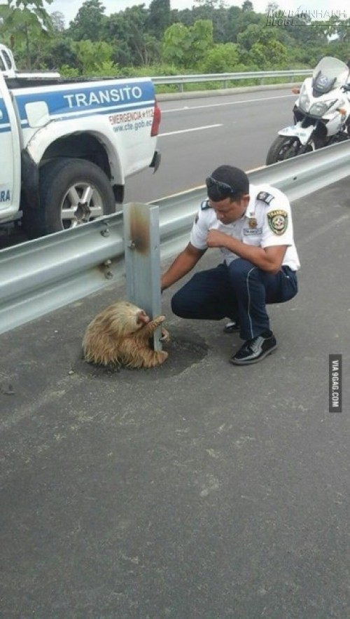 Vì bản chất của loài lười là ngại di chuyển, chỉ di chuyển lúc nào thật cần thiết, và di chuyển rất chậm, nên nếu để chú lười này tự mình băng qua đường sẽ rất nguy hiểm. Chính vì thế các chú cảnh sát tốt bụng đã giúp đưa chú sang bên kia rừng sau khi đưa chú đi kiểm tra sức khỏe và xác nhận chú vẫn khỏe mạnh.