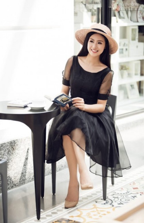 Thư thái ngồi cà phê sau một ngày làm việc, Ngọc Hân khoe vẻ đẹp ngọt ngào, rạng rỡ trong mẫu váy đen cổ điển, phủ voan bồng bềnh. Phụ kiện màu nude đem lại sự cân bằng cho phong cách, tạo nên tổng thể hài hòa.
