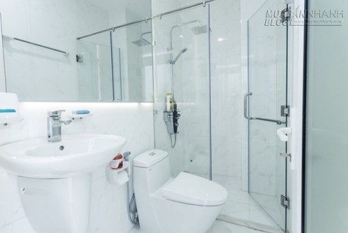 Phòng vệ sinh nhỏ nhưng đầy đủ trang thiết bị và sử dụng màu sáng, đem lại cảm giác rộng và sạch sẽ.