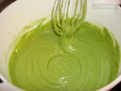 Cho khoảng 1/3 chỗ lòng trắng vào phần lòng đỏ ,quấy nhẹ tay cho đều. Tiếp đó đổ hỗn hợp trà xanh vào trộn nhẹ tay