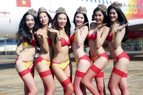 Ngọc Trinh nổi bật trong dàn chân dài bởi vóc dáng nuột nà và làn da trắng nõn khi chụp hình trên máy bay.