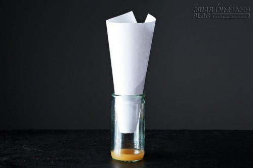 1. Cuộn tròn một tờ giấy để tạo thành chiếc phễu hình nón. Dính chặt các đầu lại bằng băng dính và đặt ở miệng một chiếc chai/lọ. Cho vào lọ một lượng nhỏ giấm táo hoặc chuối chín để làm mồi nhử. (Nếu không có giấm táo, các bạn có thể thay bằng rượu vang hoặc trái cây chín nẫu)