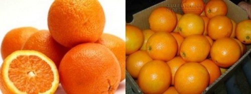 Cam Úc (trái) có vỏ đều màu, ruột sẫm; cam Trung Quốc có vỏ màu loang lỗ, không đều