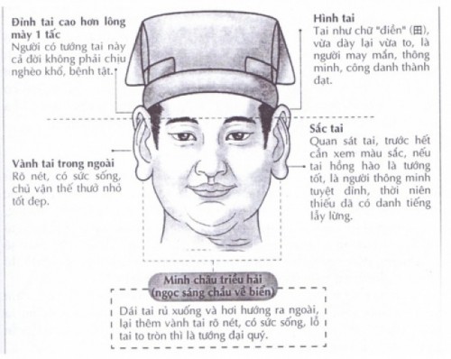 Đầu là chủ thể của cơ thể con người, hai tai được ví như hai cửa phụ ở cổng thành. Người có tai to thường khoẻ mạnh. Nếu trong tai có lông tờ nhỏ thì người này có thể trường thọ.