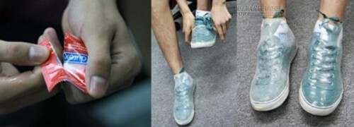 Bao cao su làm áo mưa tiện lợi cho đôi giày của bạn – Ảnh: Sưu tầm
