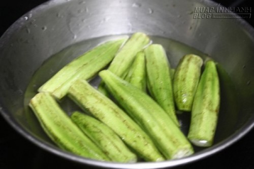Cắt nhỏ 100 g đậu bắp, cho vào nồi cùng 1/2 lít nước, đun trong 10-15 phút.